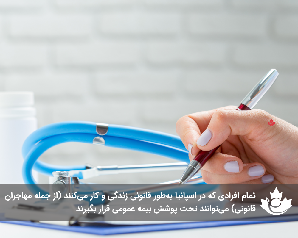 تمام افرادی که در اسپانیا بهطور قانونی زندگی و کار میکنند (از جمله مهاجران قانونی) میتوانند تحت پوشش بیمه عمومی قرار بگیرند. این پوشش برای اعضای خانواده هم اعمال میشود.